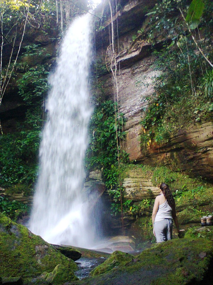 À medida que nos aproximamos do final da trilha, o barulho da água se torna perceptível. Vislumbramos então o igarapé que, alguns metros adiante, irá formar a cachoeira. As águas límpidas e de cor avermelhada convidam para um bom banho após os primeiros quilômetros de caminhada.