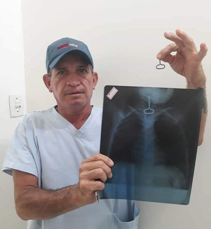 No raio x feito pela equipe de urgência e emergência do hospital, mostra claramente que o objeto ingerido obstruiu as passagens de suas vias aéreas. O enfermeiro de forma sagaz, conseguiu retirar o objeto de dentro da criança, salvando sua vida.