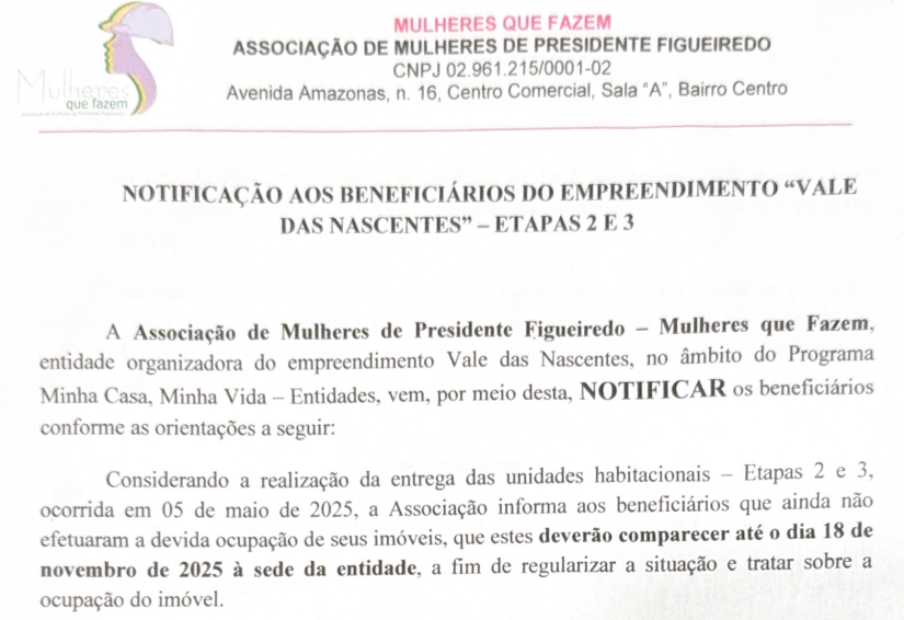 A Associação de Mulheres de Presidente Figueiredo – Mulheres que Fazem, entidade organizadora do empreendimento Vale das Nascentes, no âmbito do Programa Minha Casa, Minha Vida – Entidades, comunica formalmente aos beneficiários das Etapas 2 e 3 o que segue: