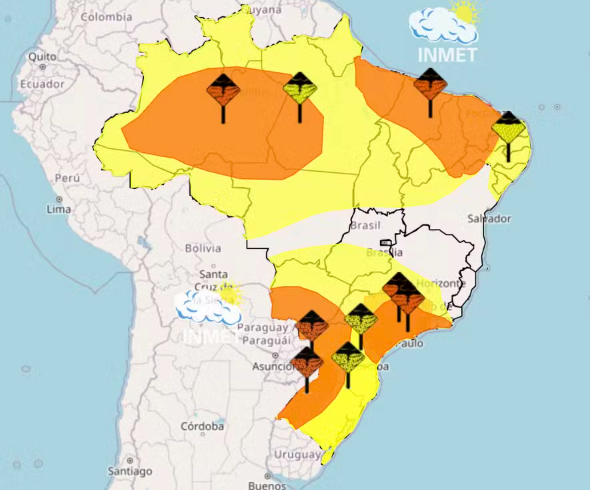 Já no Sul, as chuvas diminuem na maior parte da região, com exceção de parte do Rio Grande do Sul. A formação de um cavado deve causar temporais no oeste do Estado, com alerta laranja emitido pelo Inmet para a região.